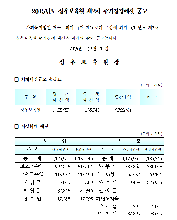 19-03-28 11:24 2015년 성우보육원 제2차 추가경정 예산공고 페이지 정보 작성자 성우보육원 댓글 0건 조회 5,000회 본문 2015년 성우보육원 제2차 추가경정 예산공고 목록 댓글목록 댓글목록 등록된 댓글이 없습니다.