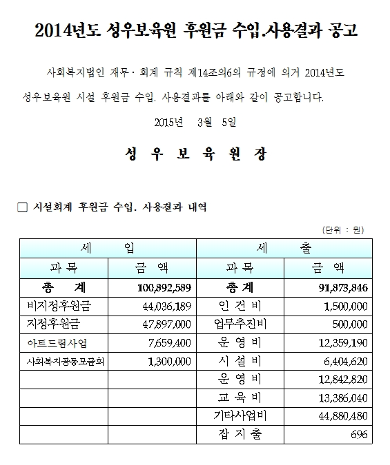 2014년 후원금 수입 및 지출명세서
