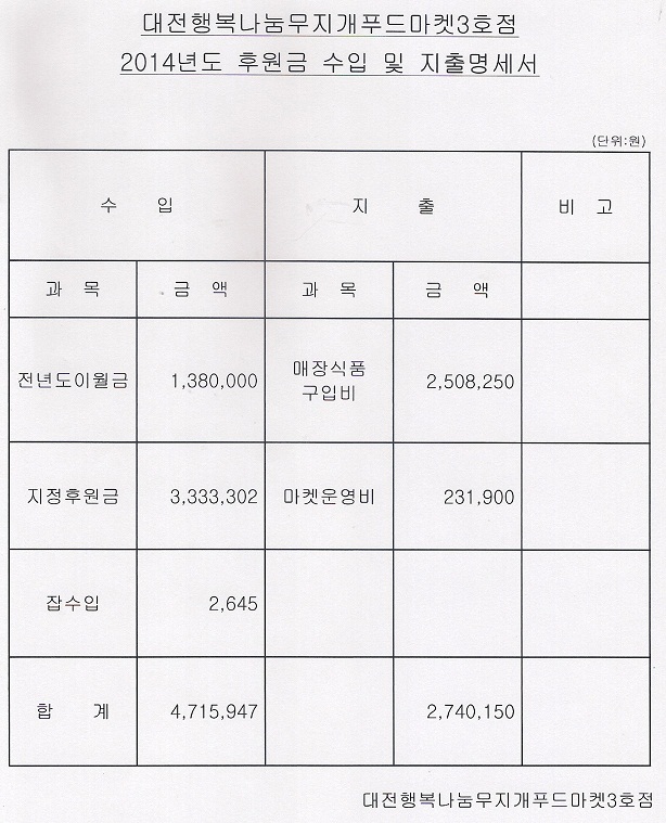 19-03-28 11:20 대전행복나눔무지개푸드마켓3호점 2014년도 후원금 수입 및 지출명세 공고 페이지 정보 작성자 성우보육원 댓글 0건 조회 5,856회 본문 대전행복나눔무지개푸드마켓3호점 2014년도 후원금 수입 및 지출명세 공고 목록 댓글목록 댓글목록 등록된 댓글이 없습니다.