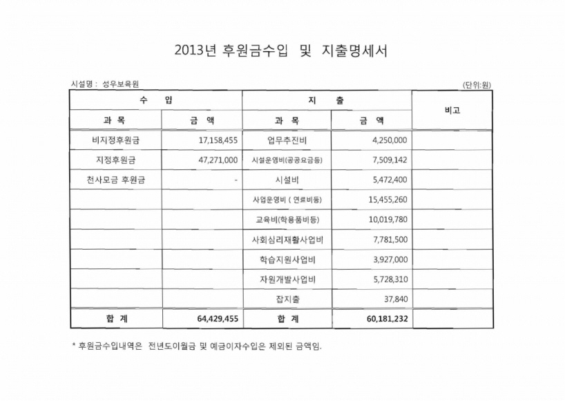 19-03-28 10:59 <공고>2013년 후원금 수입 및 지출명세서 페이지 정보 작성자 성우보육원 댓글 0건 조회 6,134회 본문 2013년 후원금 수입 및 지출명세서 목록 댓글목록 댓글목록 등록된 댓글이 없습니다.