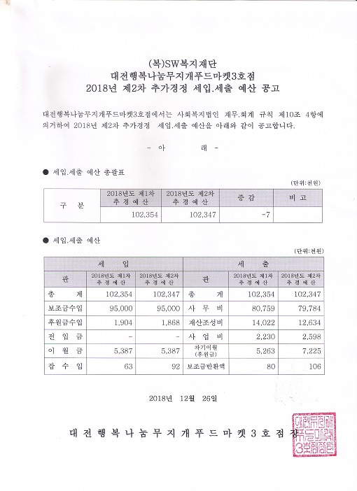 19-03-28 11:47 대전행복나누무지개푸드마켓3호점 2018년 제2차 추가경정 세입.세출 예산공고 페이지 정보 작성자 성우보육원 댓글 0건 조회 5,623회 본문 대전행복나누무지개푸드마켓3호점 2018년 제2차 추가경정 세입.세출 예산공고 목록 댓글목록 댓글목록 등록된 댓글이 없습니다.