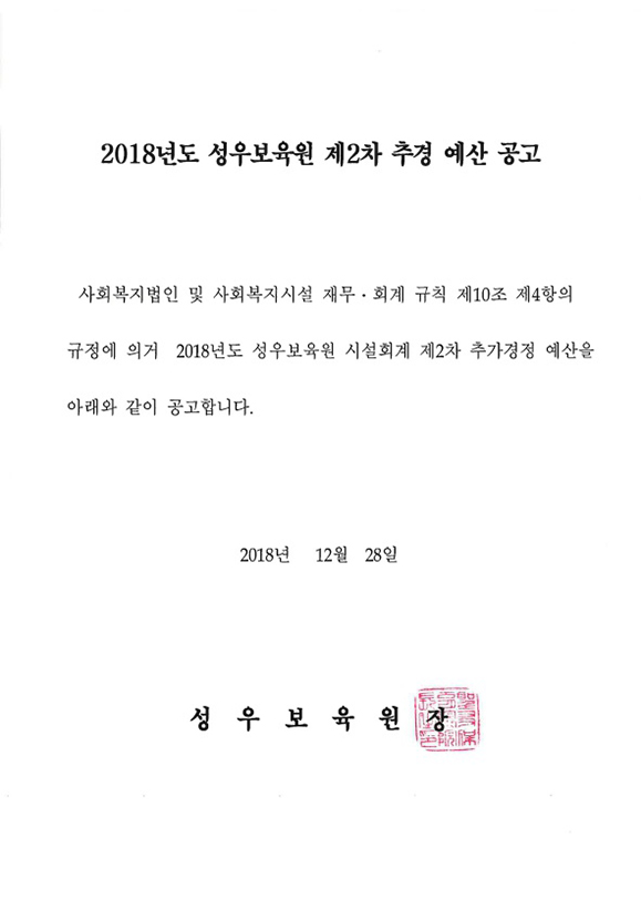 19-03-28 11:48 (공고)2018년도 제2차 추경 예산 페이지 정보 작성자 성우보육원 댓글 0건 조회 5,587회 본문 2018년도 성우보육원 제2차 추경 예산 공고 입니다. 목록 댓글목록 댓글목록 등록된 댓글이 없습니다.