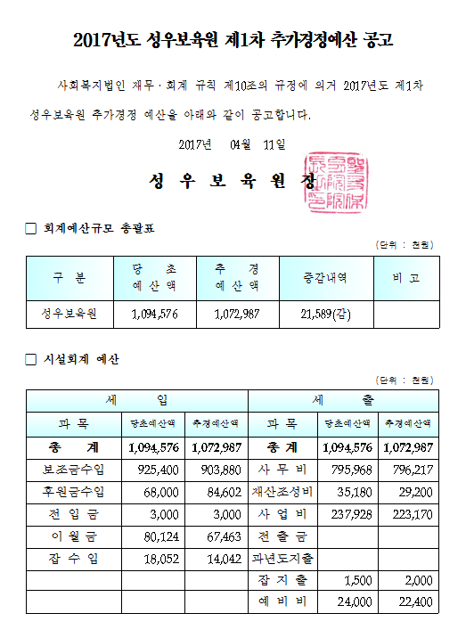 19-03-28 11:38 (공고)2017년 제1차 추가경정 예산 공고 페이지 정보 작성자 성우보육원 댓글 0건 조회 5,602회 본문 2017년 제1차 추가경정 예산 공고 목록 댓글목록 댓글목록 등록된 댓글이 없습니다.