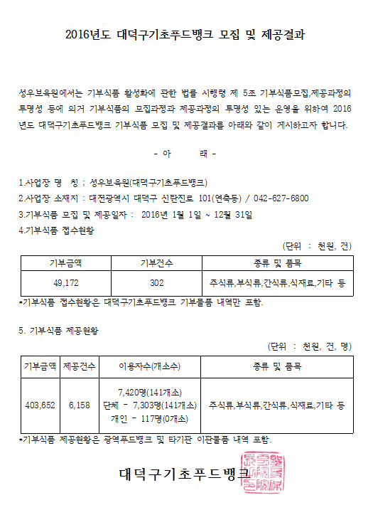 19-03-28 11:38 2016년도 대덕구기초푸드뱅크 모집 및 제공결과 페이지 정보 작성자 성우보육원 댓글 0건 조회 5,345회 본문 2016년도 대덕구기초푸드뱅크 모집 및 제공결과 목록 댓글목록 댓글목록 등록된 댓글이 없습니다.