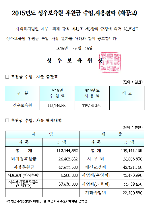 19-03-28 11:31 (재공고) 2015년 후원금 수입 및 지출명세서 페이지 정보 작성자 성우보육원 댓글 0건 조회 5,903회 본문 2015년 후원금 수입 및 지출명세서 목록 댓글목록 댓글목록 등록된 댓글이 없습니다.