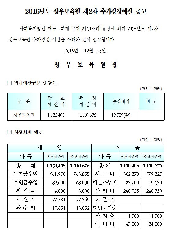 19-03-28 11:33 2016년 제2차 추가경정 예산 공고 페이지 정보 작성자 성우보육원 댓글 0건 조회 6,195회 본문 2016년 제2차 추가경정 예산 공고 목록 댓글목록 댓글목록 등록된 댓글이 없습니다.