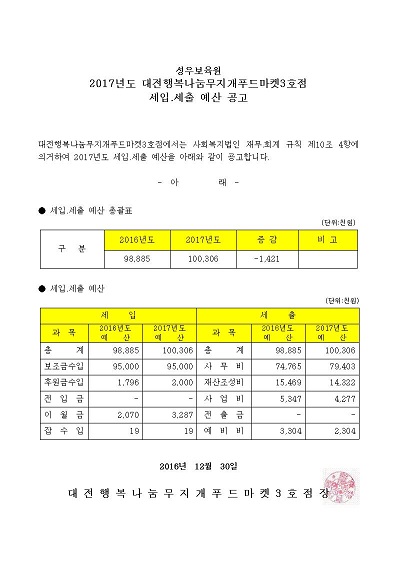 19-03-28 11:34 대전행복나눔무지개푸드마켓3호점 2017년 세입.세출 예산 페이지 정보 작성자 성우보육원 댓글 0건 조회 5,841회 본문 대전행복나눔무지개푸드마켓3호점 2017년 세입.세출 예산 목록 댓글목록 댓글목록 등록된 댓글이 없습니다.