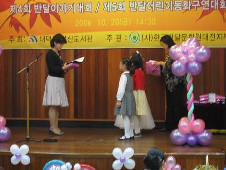 2006.10.22 10월 20일 반달이야기 대회 페이지 정보 작성자 성우보육원 댓글 0건 조회 1,721회 본문 10월20일(금요일)반달 동화구연이 안산도서관 시청각실 1층에서 있었습니다. 목록 댓글목록 댓글목록 등록된 댓글이 없습니다.