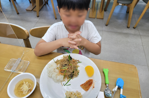 보람코아 지하에 위치한 은진백반에서 아이들을 위해 저녁식사로 잡채와 단무지, 후…