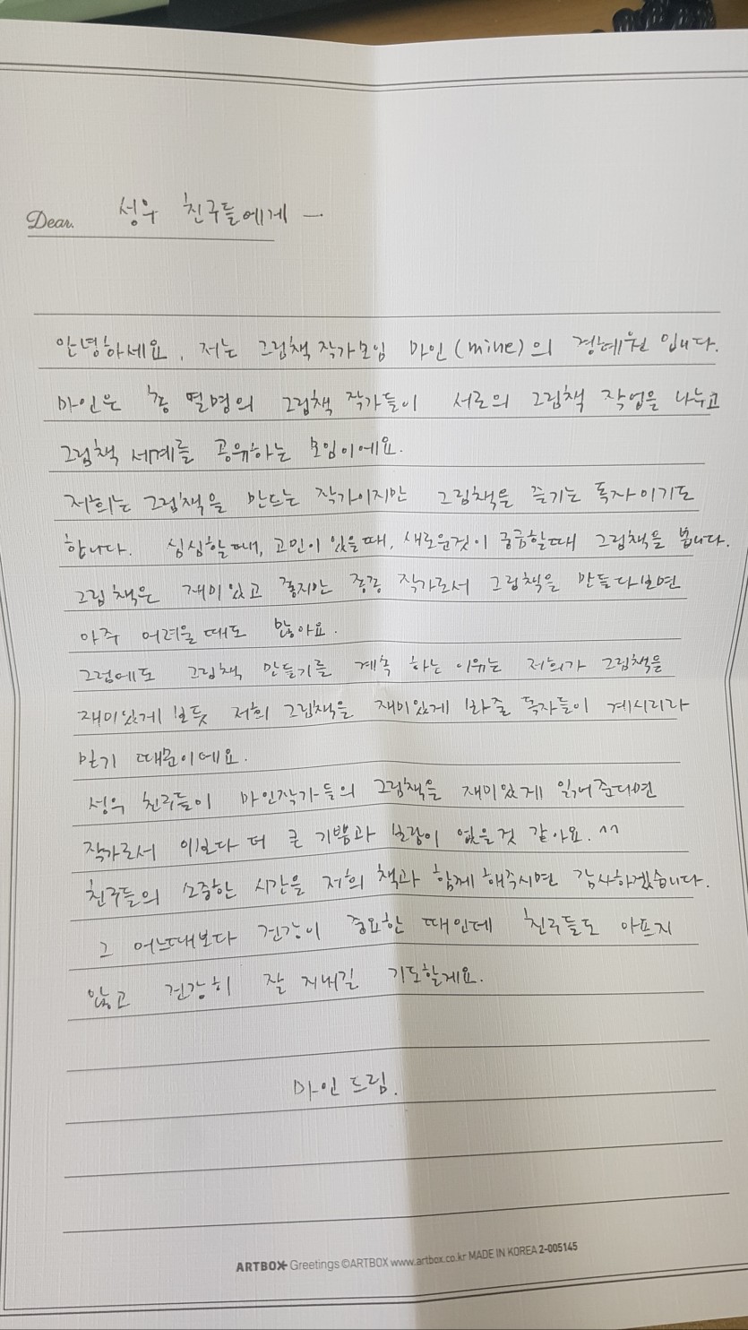 20200527 마인(mine-그림책작가모임)의 마음 따뜻한 책 선물 페이지 정보 작성자 성우보육원 댓글 0건 조회 5,504회 본문 마인(mine)이라는 그림책작가모임에서 성우아이들을 위해 마음 따뜻한 손편지와 함께 책 선물을 후원해주셨습니다.우리 아이들을 '나라의 미래'라고 표현해주시는, 작가님들의 응원을 통해 오늘도 성우아이들은 사랑을 한가득 받게 되었습니다.^^성우아이들이 즐거운 상상의 나래를 맘껏 펼칠 수 있도록 도움을 주신 마인 작가님들께 감사의 인사를 드립니다. 목록 댓글목록 댓글목록 등록된 댓글이 없습니다.