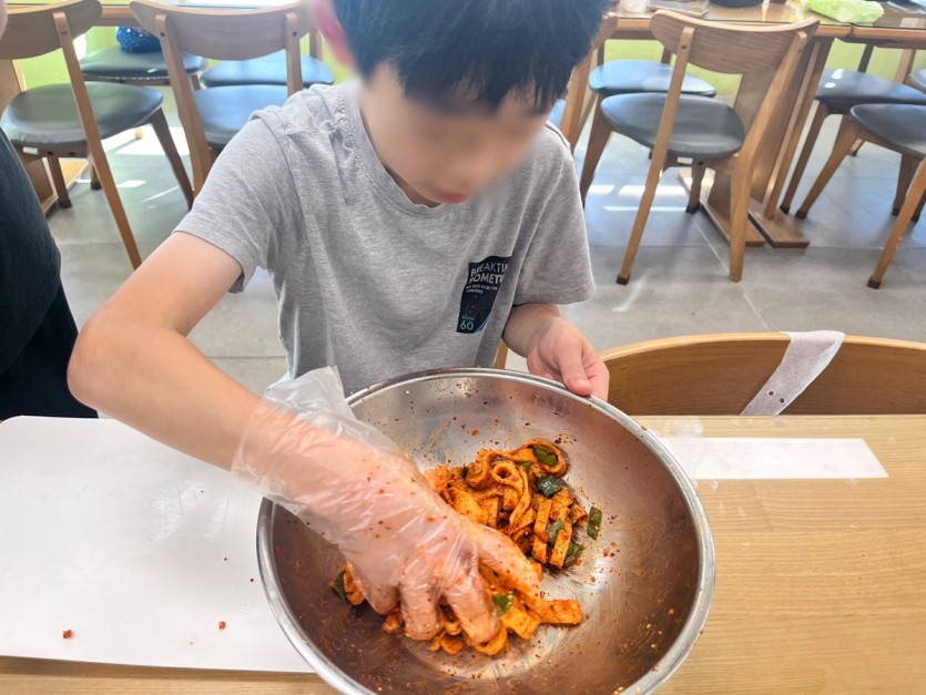 조심스럽게 칼질하여 어묵을 채썰고 선생님께서 주신 양념으로