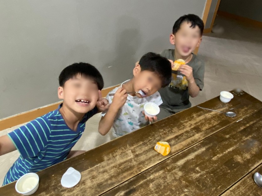 저녁 식사 후 모두 모여 부드러운 생크림 요플레를 맛있게 먹으며